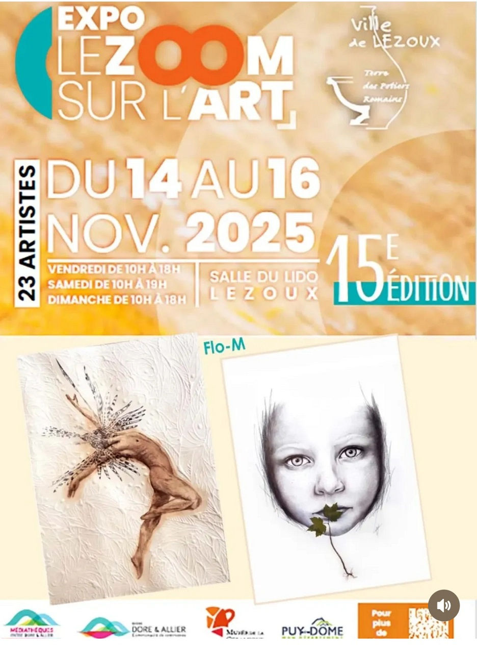 La ville de Lezoux propose la 15ème édition de l'exposition LeZoom sur l'Art, en accueillant 23 artistes dont Flo-M. L'exposition est salle du Lido du 14 au 16 novembre 2025.